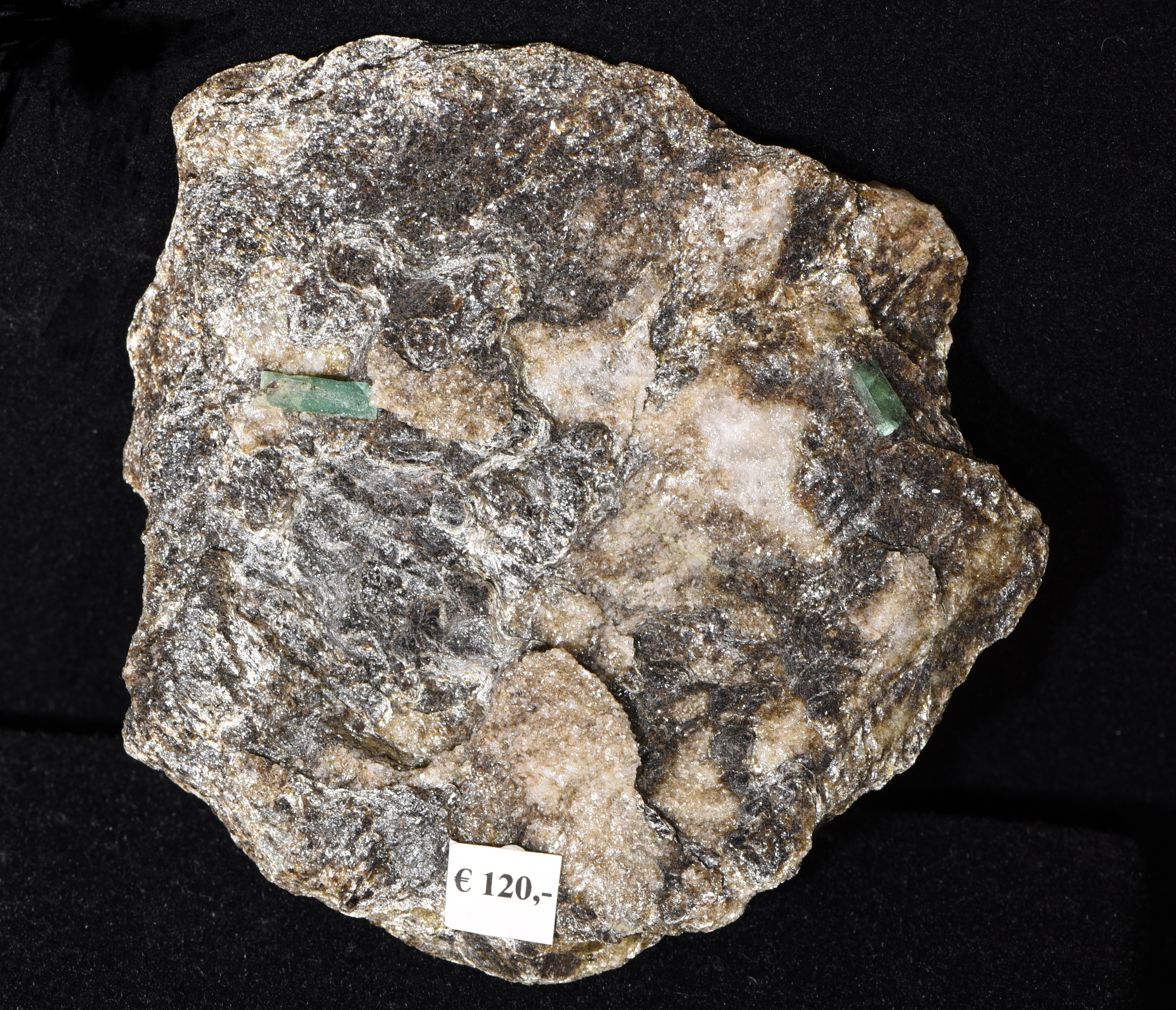Auf dieser Biotit-Glimmerschieferplatte sitzen 2 Smaragde. Der größere misst 1 cm, der kleinere 7 mm. Der linke Smaragd hat eine etwas bessere Farbe als der rechte und beide weisen etwas Transparenz auf. Im Biotit-Glimmerschiefer sind einzelne Spuren von Quarz zu finden und der Biotit-Glimmer glänzt wie Silber.