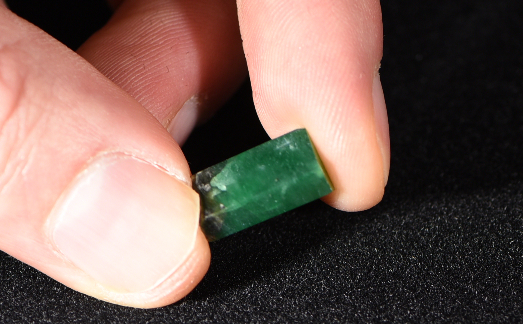 Die Farbe faszinierende Farbe dieses geschliffenen Smaragdes harmoniert perfekt mit den Biotit-Einschlüssen an der Unterseite. Die Naturflächen sind nachgeschliffen. Fundort ist die Smaragdmine im Habachtal (Bramberg, Salzburg, Österreich).